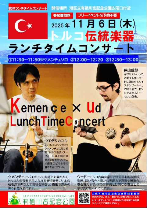 Performance 在日シークイベントに誘われたので、ラバーブもって行ってきます。 ランチタイムコンサート有栖川宮公園公式ホームページhttps://minato-park.jp/azabu/topics/6021/場所 有栖川宮記念公園広尾口付近時間 ①11:30~11:50 ②12:00~12:20 ③12:30~13:00参加費 無料※フリーイベント出演 ウエダタカユキ(ケメンチェ)、柴山哲郎(ウード)※詳細は4月末発行の秋のイベントチラシをご覧ください。※雨の場合は中止。当日までにHPでお知らせいたします。順延日はございません。rあんち 🎶 トルコ音楽祭2025秋 🎶昨年好評につき第2弾!わたしたちは夕方5時から演奏です。 📅 日時:2025/11/8(土) 16:30開場 / 17:00開演 / 20:00終演予定📍 場所:エルトゥールル講堂(代々木上原駅徒歩6分)東京都渋谷区大山町1-19 新館地下一階🎻 出演 – Tokyo Sufi 生徒アンサンブル – 石田秀幸(Ney) – 石田美香(Tanbur) – ウエダタカユキ(Kemençe) – 大平 清(Saz) – 鈴木未知子(Kanun) – 柴山哲郎(Ud) – FUJI(Saz) – ノミヤタカコ(Perküsyon) – Famous Japanese(Band)主催: ユヌスエムレトルコ文化センターお問い合わせ: michikomusicx@gmail.com スワラジスタン展示会内ミニライブ 日時:2025年11月14日(金)・15日(土)各日 午後2時〜(約30〜45分)会場:サンデールーム 2F ギャラリースペース(群馬県前橋市千代田町5-4-2)参加費:無料(カフェでのオーダーをお願いいたします) 東京・吉祥寺を拠点に活動する Tokyo Sufi が、前橋にやってきます。生徒アンサンブルと共に、シルクロードの響きを伝えるミニライブを開催します。 演奏では、 アフガニスタン,パキスタンの ラバーブ 中東の ウード トルコの ケメンチェ フレームドラムなど など、多彩な楽器を紹介しながら音の旅をご一緒します。 スーフィー自然素材の衣服を扱う スワラジスタン展示会 とともに、音楽と手仕事が響き合う午後のひとときをお楽しみください。 ☕ 会場はサンデールーム内カフェ併設です。ぜひドリンクやお食事とともにお過ごしください。 Talk to us ご質問などあれば、こちらからお問い合わせいただけます。 Get In Touch